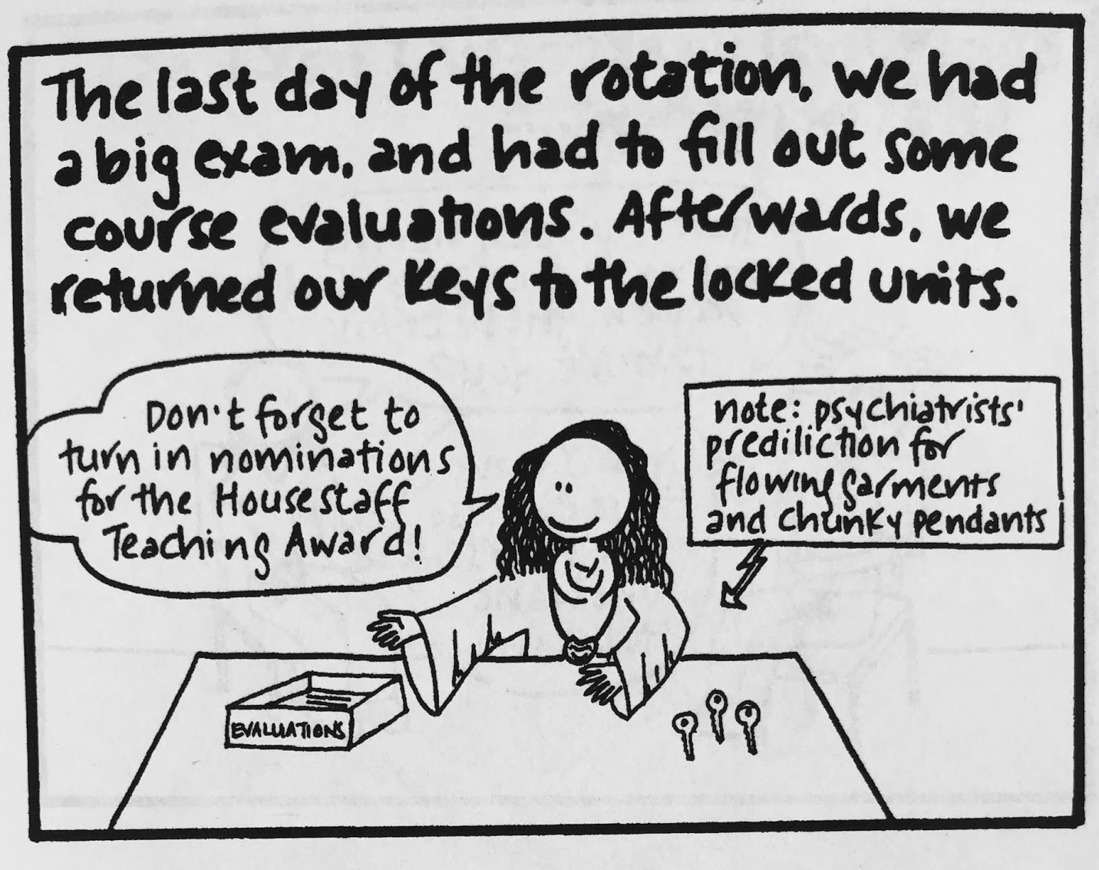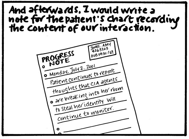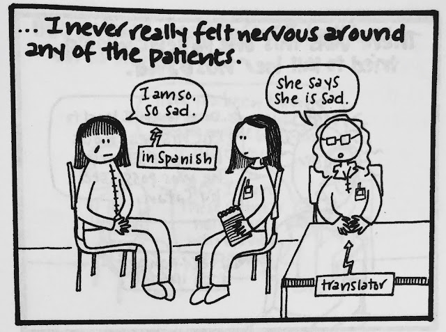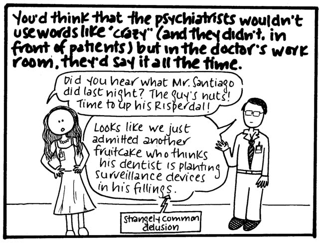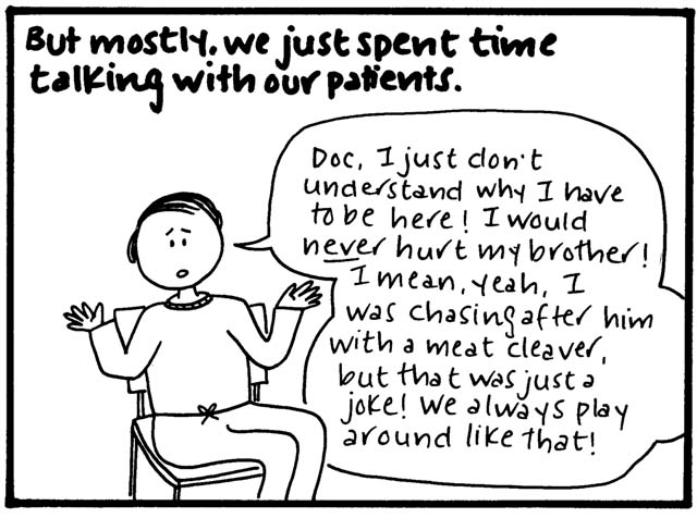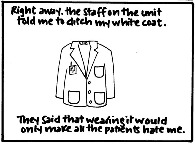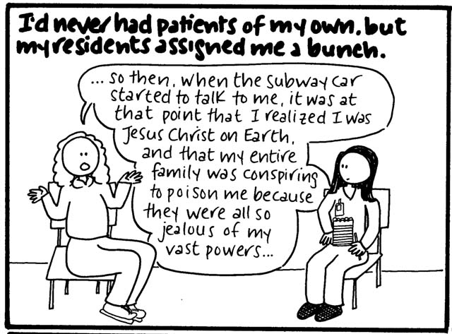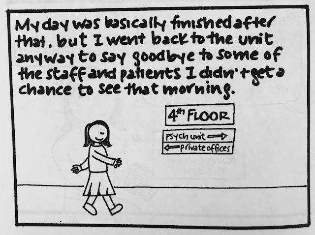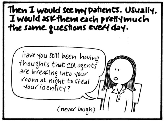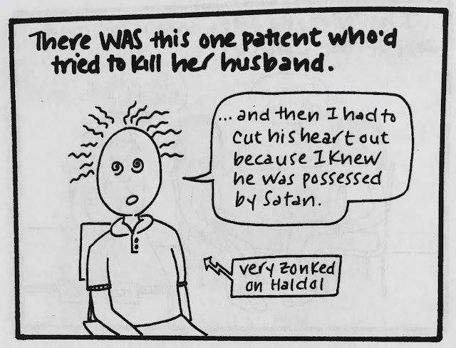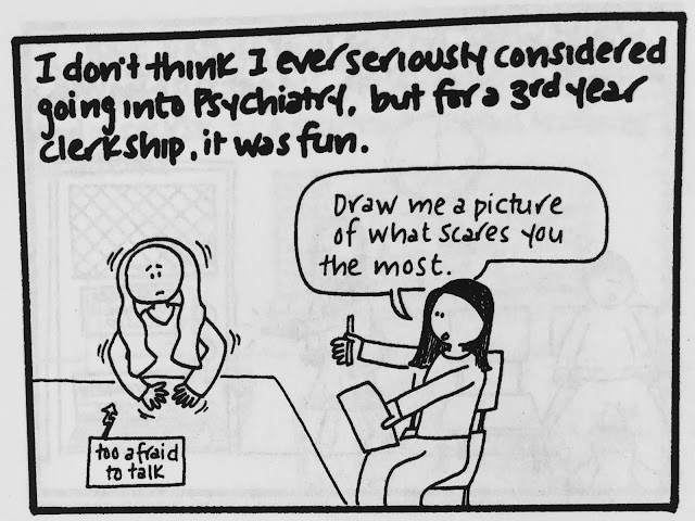 Two small points. One is that I think it's not necessarily the kind of topic I'd write about so freely now, because, you know, mental health awareness is important and sensitive and all that. But for what it's worth, every single patient interaction or expressed delusion in this comic was absolutely true, almost to the word (if somewhat condensed in certain cases). Actually, all of it is true, right down to what people wore. (I was mesmerized by the chunky pendants and flowing tops my course director wore and therefore studied them in great depth before drawing them...badly.)