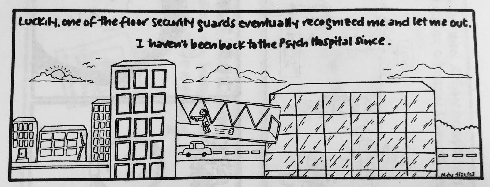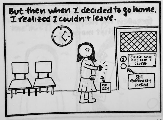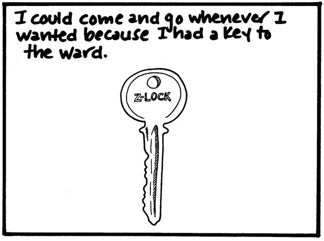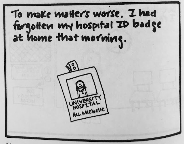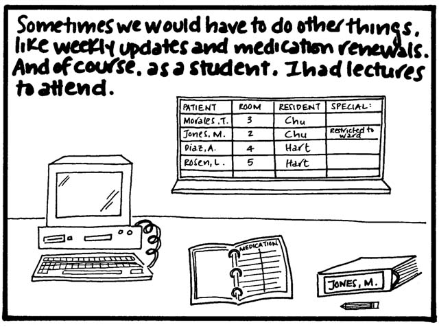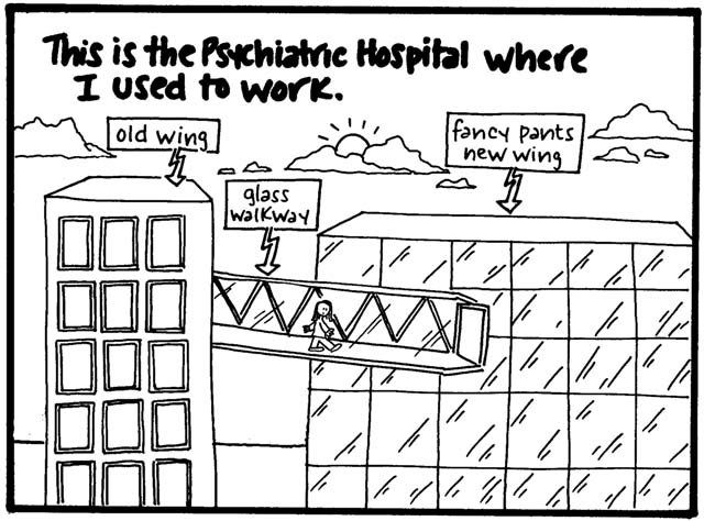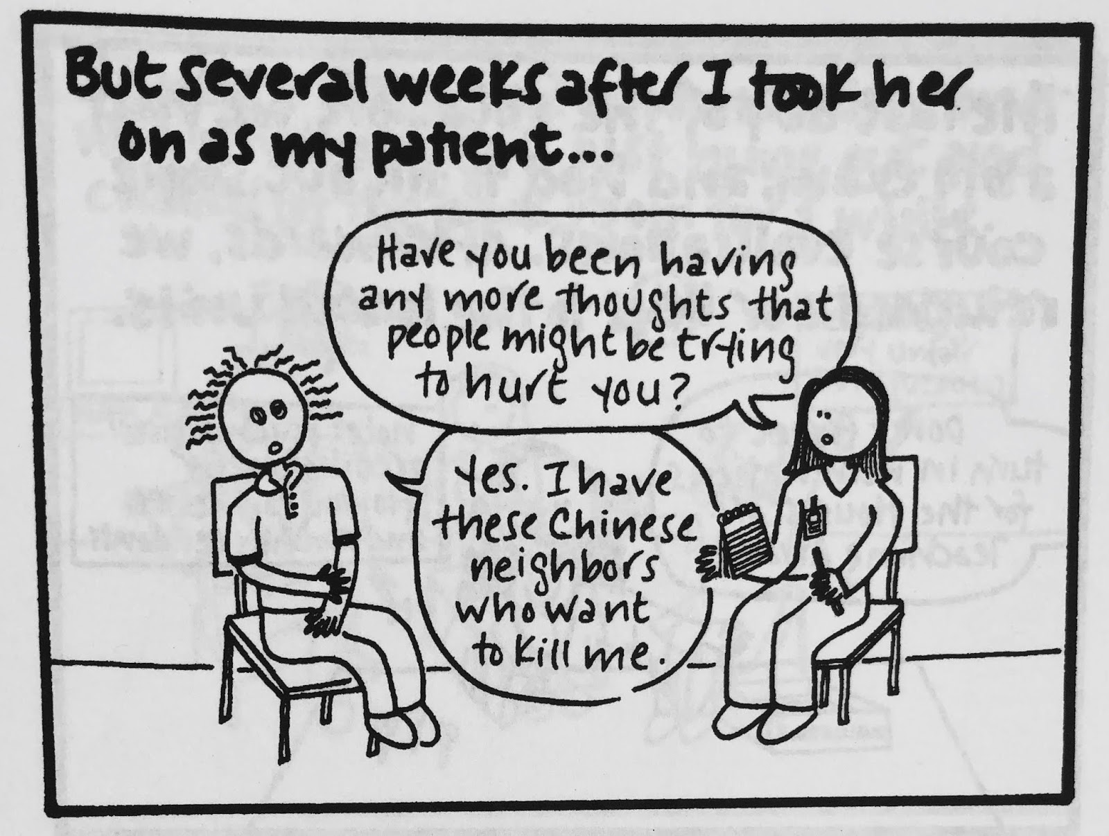 Two small points. One is that I think it's not necessarily the kind of topic I'd write about so freely now, because, you know, mental health awareness is important and sensitive and all that. But for what it's worth, every single patient interaction or expressed delusion in this comic was absolutely true, almost to the word (if somewhat condensed in certain cases). Actually, all of it is true, right down to what people wore. (I was mesmerized by the chunky pendants and flowing tops my course director wore and therefore studied them in great depth before drawing them...badly.)