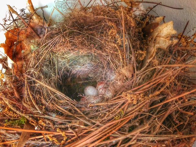 The consensus in the anesthesia lounge, both from the build of the nest and the speckling on the eggs, was that these were Carolina wrens. There were five little eggs tucked in there, the size of those Cadbury chocolate eggs with the candy shells sold around Easter (they're what M&Ms should ideally be, in my opinion--better chocolate, thicker shell), and while it certainly made me somewhat monstrous for thinking of this mother bird's clutch of eggs in terms of snack food, I'm sure in the wild, outside of the safety of the high shelf in our garage, the eggs would be a snack for someone.