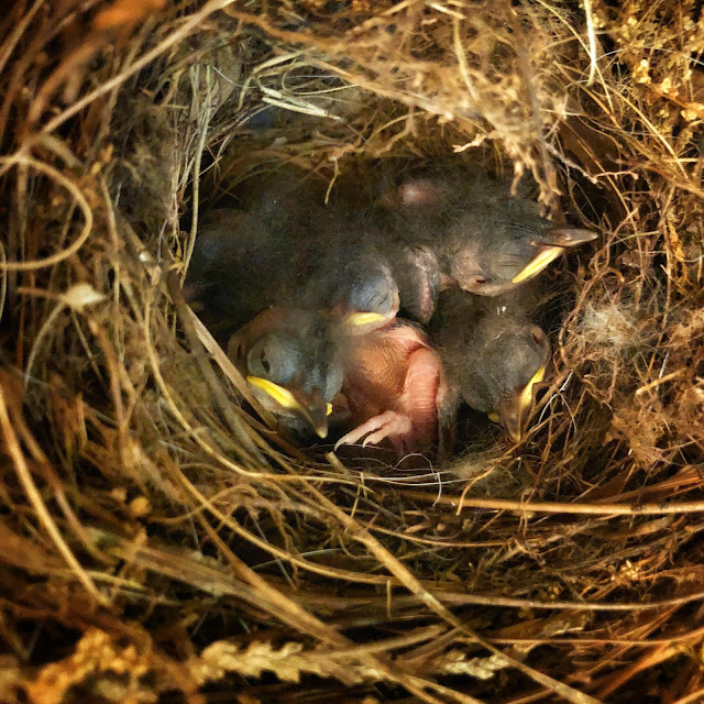 Yesterday, when I went to peek at the birds, it started to look a bit crowded. There was that adolescent gangliness to the brood--they still all seemed content to stay inside, they had a few tufts of baby down showing through, but the nest suddenly seemed like all arms and legs.