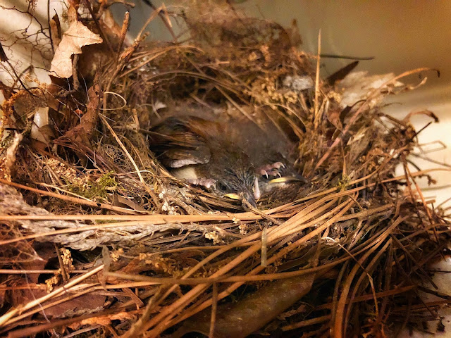 So we had this bird nest in our garage. Our nanny first noticed it a few weeks ago, high up on a shelf something like eight, nine feet up, propped on a shelf against a corner, atop of a pack of Costco bulk terry cloth towels. We've had a broken window in the garage for...I don't know, probably going on a year now (don't judge), and I suppose it was only natural that at some point, a bird might find its way indoors and make itself at home.