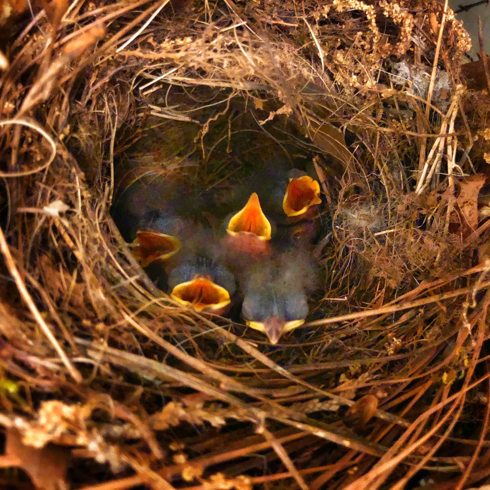 But there were no dead baby birds. Every time I peeked at them (just peeked, never touched), I did a quick head count. I couldn't tell them apart, I didn't name them or anything, I wasn't crazy--but just a quick head count. One, two, three, four, five. Every day, all five were there.